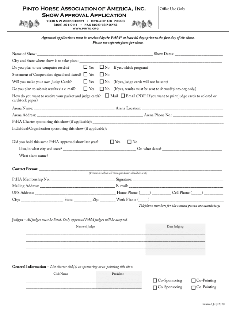 Pinto Horse Association of America, Inc. Show Approval ApplicationOffice Use Only7330 NW 23rd Street Bethany, OK 73008 (405) 4910111 FAX (405) 7870773 www.pinto.orgApproval applications must be received