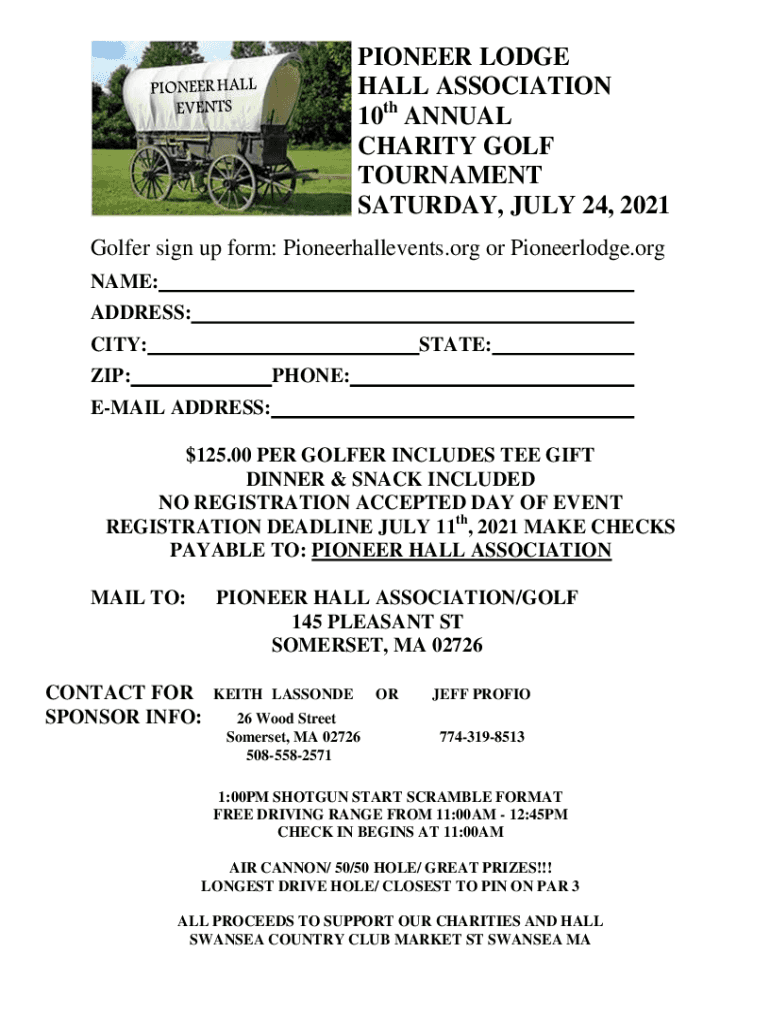 PIONEER LODGE HALL ASSOCIATION 10th ANNUAL CHARITY GOLF TOURNAMENT SATURDAY, JULY 24, 2021, Golfer sign up form: Pioneerhallevents.org or Pioneer lodge.org NAME: ADDRESS: CITY:STATE:ZIP:PHONE:EMAIL