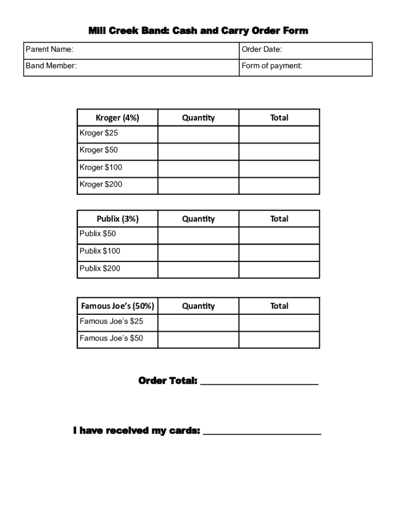 Mill Creek Band: Cash and Carry Order Form Parent Name:Order Date:Band Member:Form of payment:Kroger (4%)QuantityTotalQuantityTotalQuantityTotalKroger $25 Kroger $50 Kroger $100 Kroger $200Publix