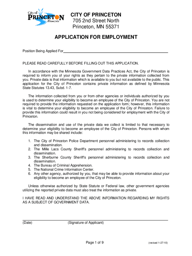 CITY OF PRINCETON 705 2nd Street North Princeton, MN 55371 APPLICATION FOR EMPLOYMENT Position Being Applied Release READ CAREFULLY BEFORE FILLING OUT THIS APPLICATION. In accordance with the Minnesota