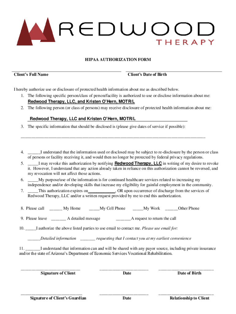 HIPAA AUTHORIZATION FORM Clients Full NameClients Date of Birth hereby authorize use or disclosure of protected health information about me as described below. 1. The following specific person/class