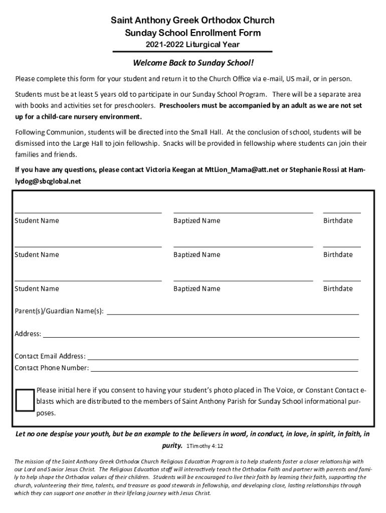 Saint Anthony Greek Orthodox Church Sunday School Enrollment Form 20212022 Liturgical YearWelcome Back to Sunday School! Please complete this form for your student and return it to the Church Office