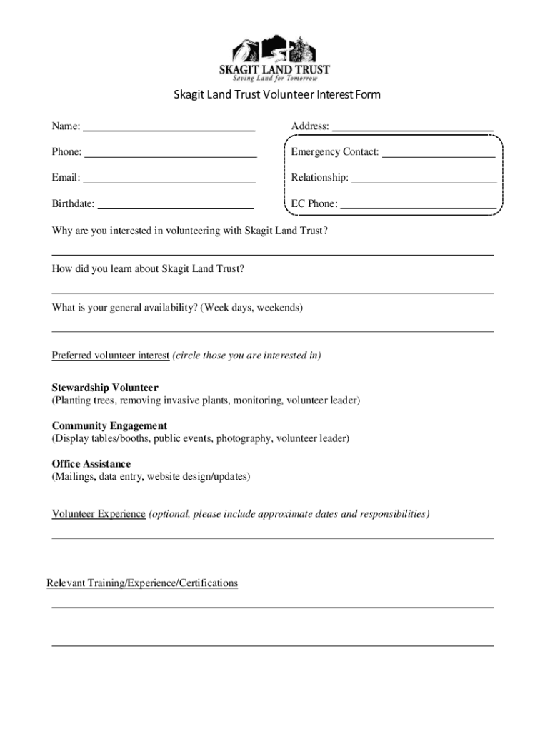 Skagit Land Trust Volunteer Interest Form Name:Address:Phone:Emergency Contact:Email:Relationship:Birthdate:EC Phone:Why are you interested in volunteering with Skagit Land Trust? How did you learn