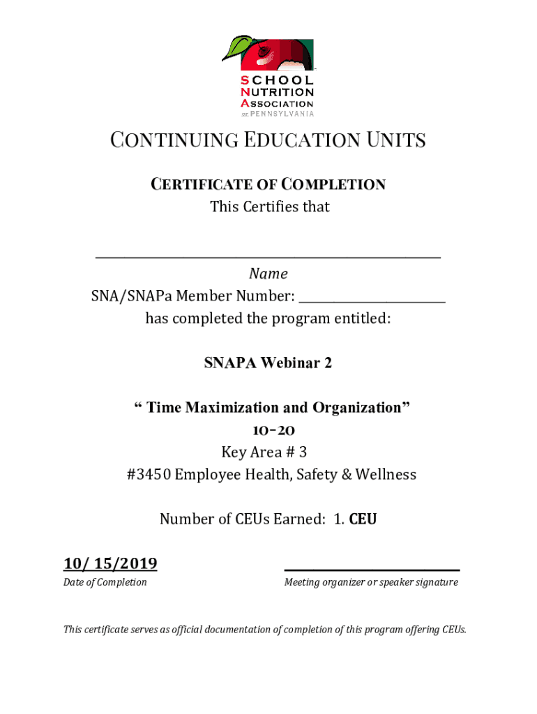Continuing Education Units Certificate of Completion This Certifies that Name SNA/Snap Member Number: has completed the program entitled: SNAP Webinar 2 Time Maximization and Organization 1020 Key