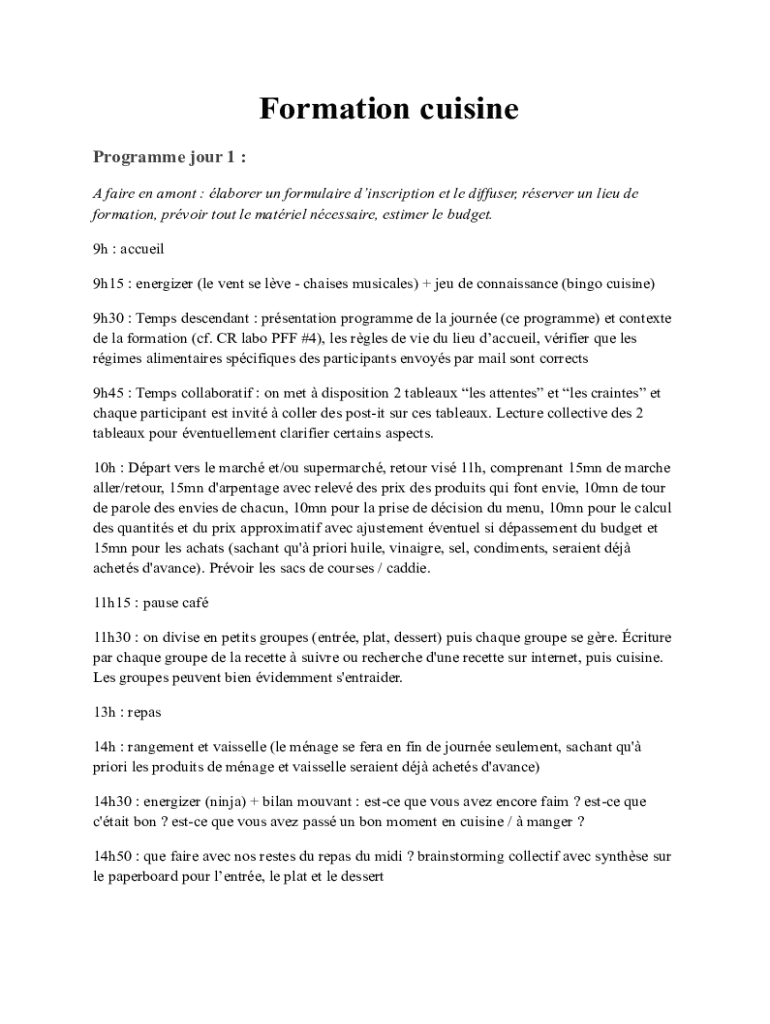 Formation cuisine Program four 1 : A free en among : laborer UN formula ire inscription et LE diffuser, server UN lieu DE formation, prior tout LE material necessary, BS timer LE budget. 9h : actual