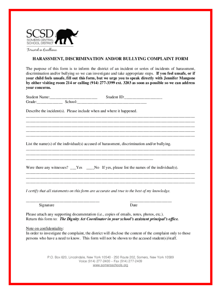 HARASSMENT, DISCRIMINATION AND/OR BULLYING COMPLAINT From The purpose of this form is to inform the district of an incident or series of incidents of harassment, discrimination and/or bullying, so