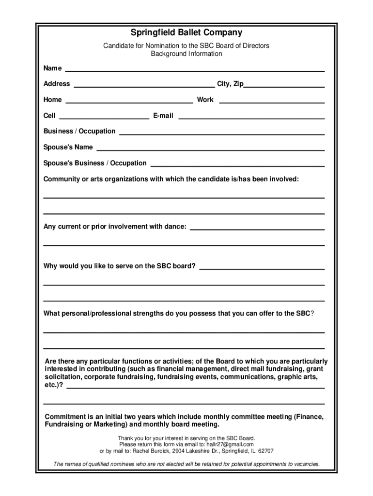 Springfield Ballet Company Candidate for Nomination to the SBC Board of Directors Background Information Name Addressing, ZipHomeWorkCellEmailBusiness / Occupation Spouse\'s Name Spouse\'s Business