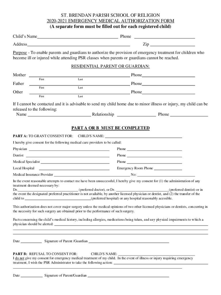 ST. BRENDAN PARISH SCHOOL OF RELIGION 20202021 EMERGENCY MEDICAL AUTHORIZATION FORM (A separate form must be filled out for each registered child) Child's NamePhoneAddressZipPurpose To enable parents