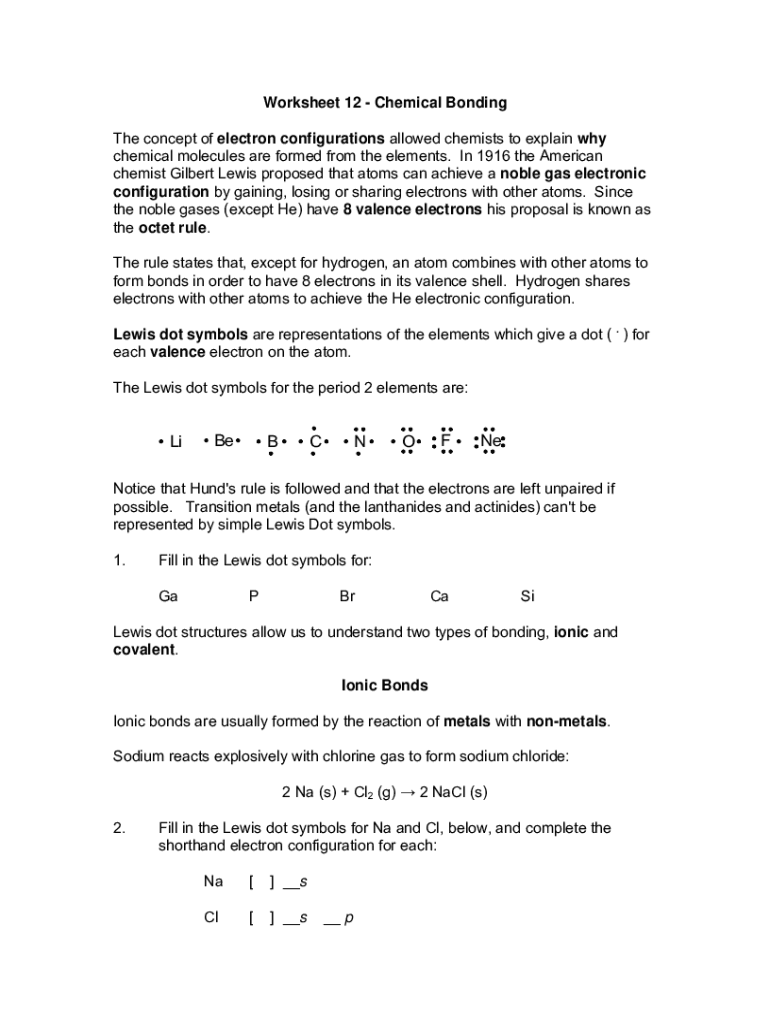Worksheet 12 Chemical Bonding The concept of electron configurations allowed chemists to explain why chemical molecules are formed from the elements. In 1916 the American chemist Gilbert Lewis proposed