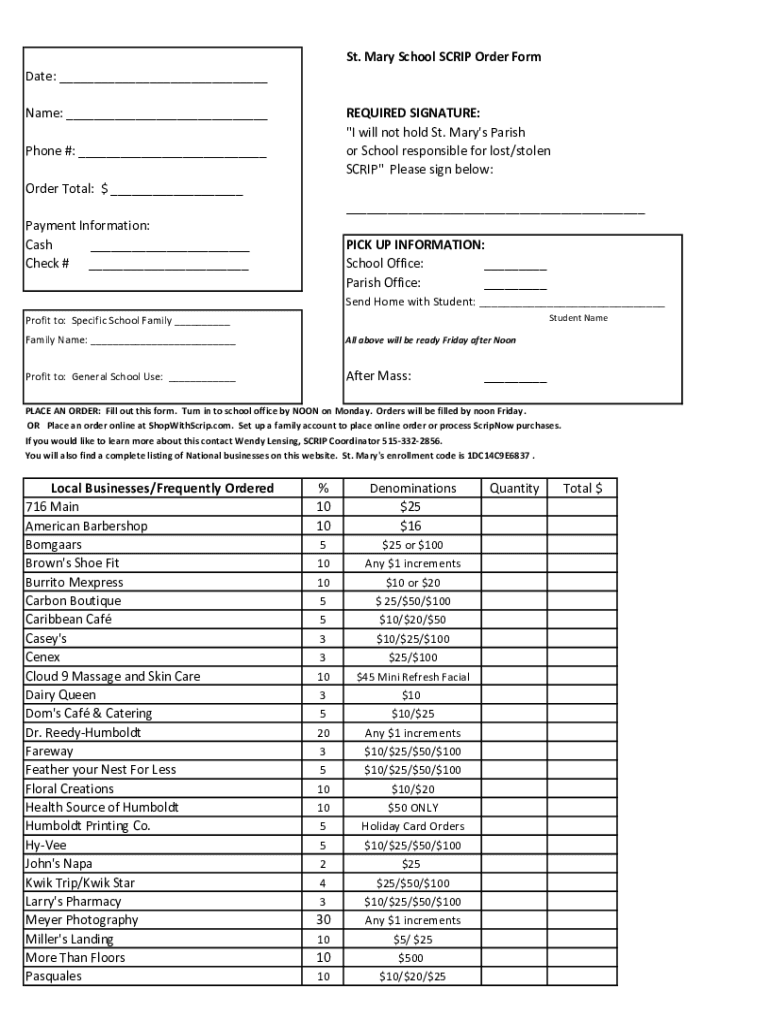 Get the free St. Mary School SCRIP Order Form REQUIRED SIGNATURE: PICK ...