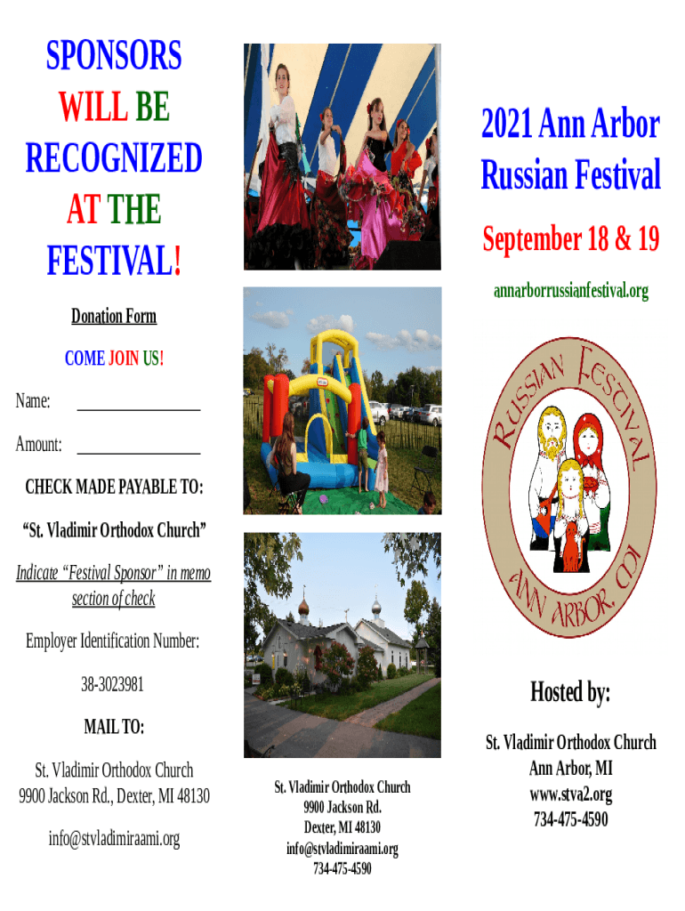 SPONSORS WILL BE RECOGNIZED AT THE FESTIVAL!2021 Ann Arbor Russian Festival September 18 & 19 annarborrussianfestival. Ordination Form COME JOIN US! Name:___Amount:___CHECK MADE PAYABLE TO: St. Vladimir
