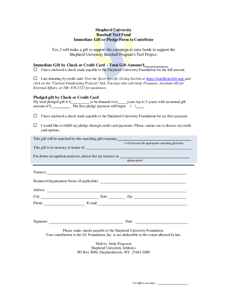 Shepherd University Baseball Turf Fund Immediate Gift or Pledge Form to Contribute Yes, I will make a gift to support the campaign to raise funds to support the Shepherd University Baseball Programs