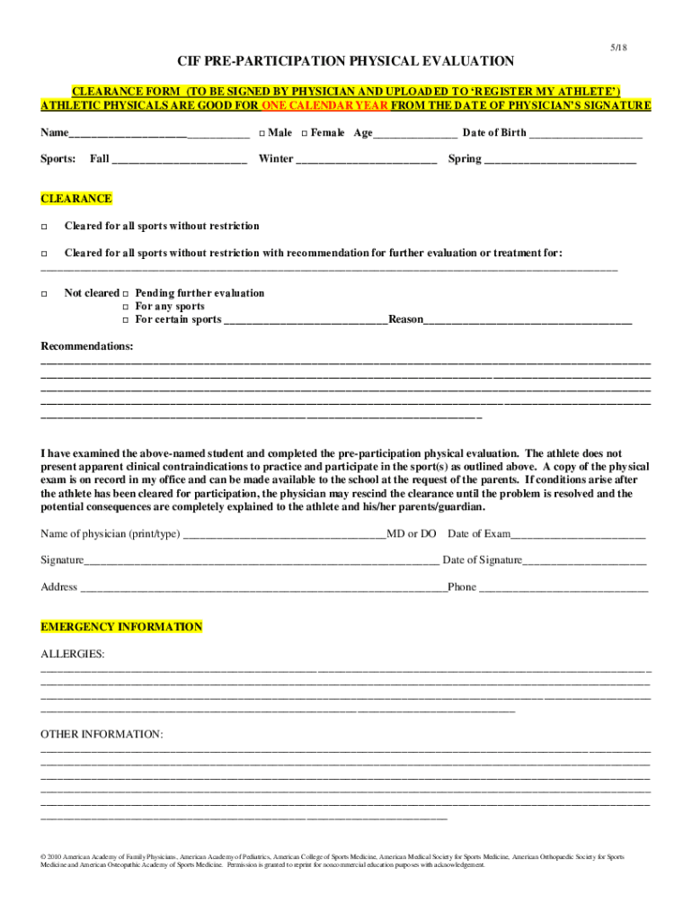 5/18CIF PARTICIPATION PHYSICAL EVALUATION CLEARANCE FORM (TO BE SIGNED BY PHYSICIAN AND UPLOADED TO REGISTER MY ATHLETE) ATHLETIC PHYSICALS ARE GOOD FOR ONE CALENDAR YEAR FROM THE DATE OF PHYSICIANS