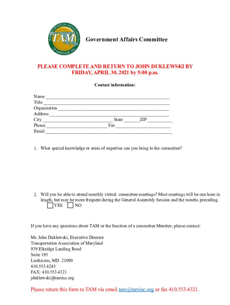 Government Affairs CommitteePLEASE COMPLETE AND RETURN TO JOHN DUKLEWSKI BY FRIDAY, APRIL 30, 2021, by 5:00 p.m. Contact information: Name Title Organization Address City State ZIP Phone Fax Email