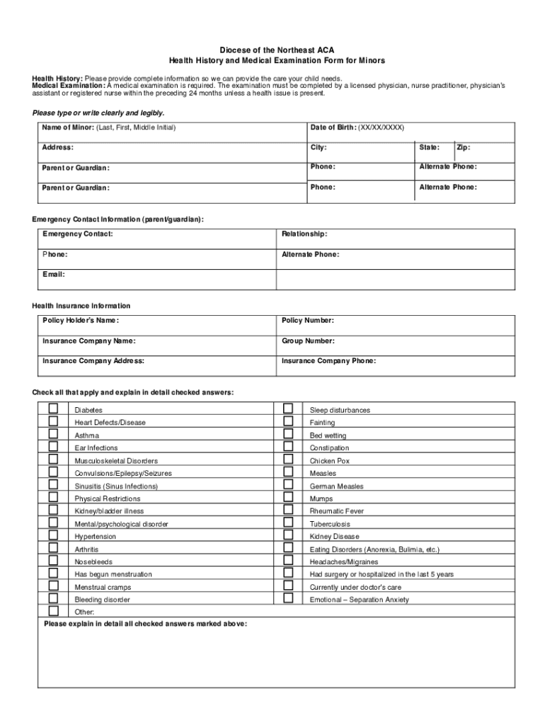 Diocese of the Northeast ACA Health History and Medical Examination Form for Minors Health History: Please provide complete information, so we can provide the care your child needs. Medical Examination: