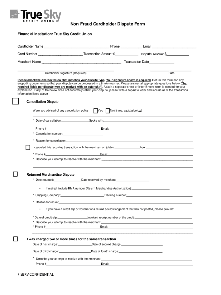 Non Fraud Cardholder Dispute Form Financial Institution: True Sky Credit Union Cardholder Name Phone Email Card Number Transaction Amount dispute Amount merchant Name Transaction Date Cardholder Signature
