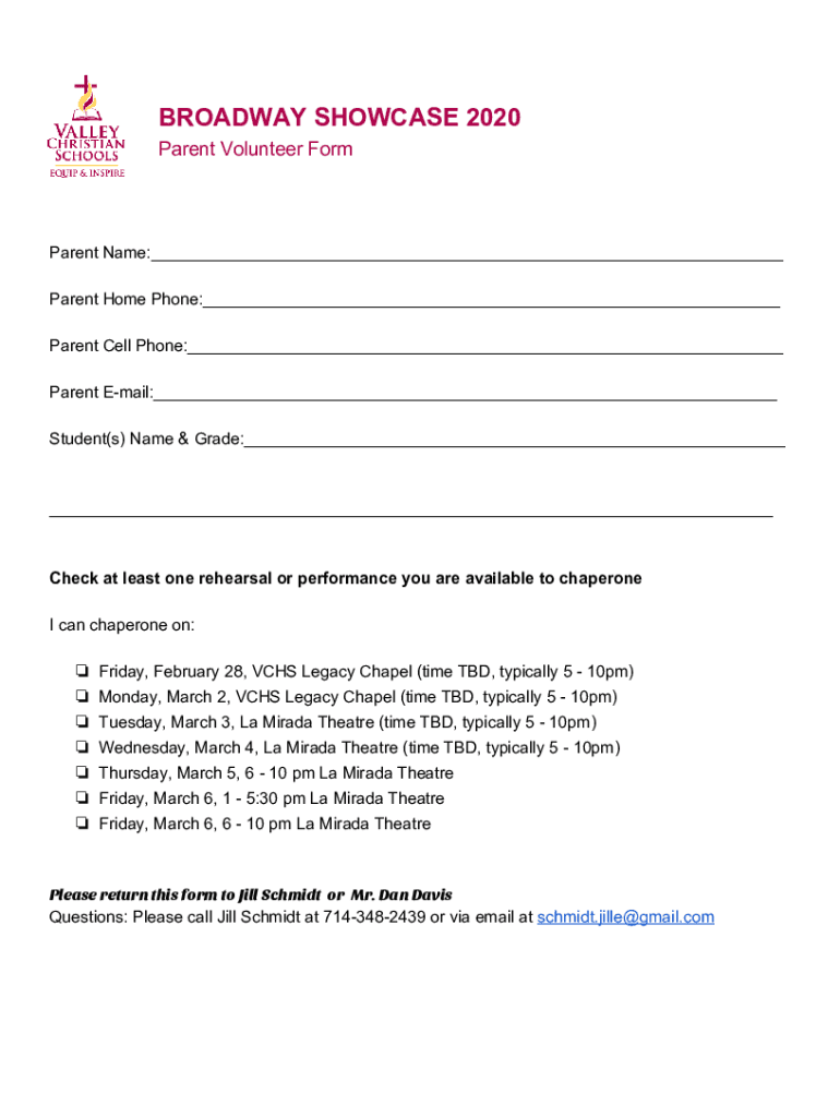 BROADWAY SHOWCASE 2020 Parent Volunteer Forepart Name: Parent Home Phone: Parent Cell Phone: Parent Email: Student(s) Name & Grade: Check at least one rehearsal or performance you are available to