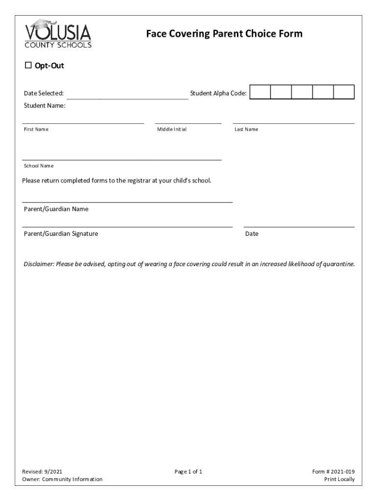 Face Covering Parent Choice Form Opt-out Date Selected:Student Alpha Code:Student Name: First NameMiddle Initially Homeschool Nameplate return completed forms to the registrar at your child\'s school.