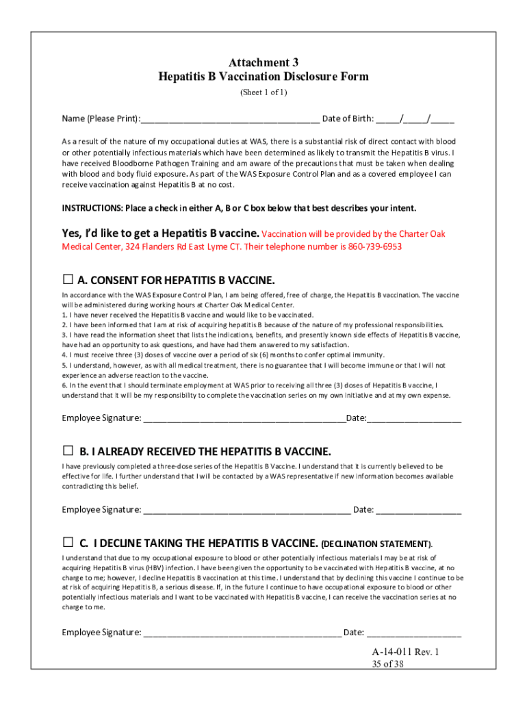 Attachment 3 Hepatitis B Vaccination Disclosure Form (Sheet 1 of 1)Name(Greasepaint): DateofBirth: / / AsaresultofthenatureofmyoccupationaldutiesatWAS, thereisasubstantialriskofdirectcontactwithblood