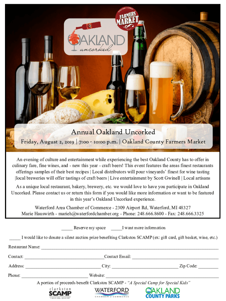 Annual Oakland Uncorked Friday, August 2, 2019 7:00 10:00 p.m. Oakland County Farmers Market An evening of culture and entertainment while experiencing the best Oakland County has to offer in culinary