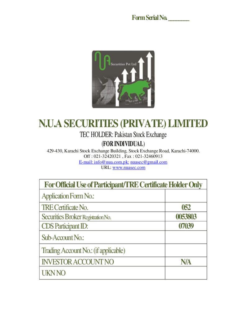 Form Serial No. N.U.A SECURITIES (PRIVATE) LIMITED TEC HOLDER: Pakistan Stock Exchange (FOR INDIVIDUAL) 429430, Karachi Stock Exchange Building, Stock Exchange Road, Karachi74000. Off : 02132420321,