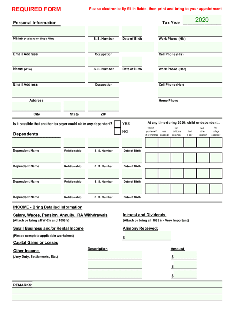 REQUIRED Formulas electronically fill in fields, then print and bring to your appointment2020Personal Informational Year Name (Husband or Single Filer's. S. NumberEmail Addressable of Earthwork Phone