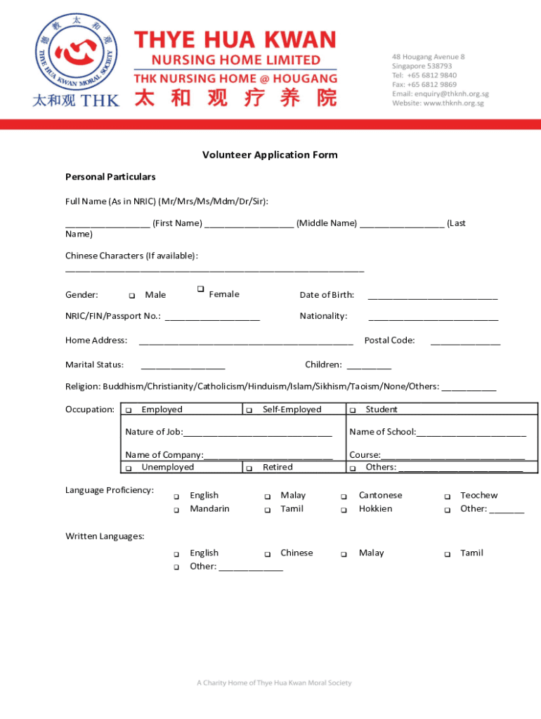 Volunteer Application Form Personal Particulars Full Name (As in ERIC) (Mr/Mrs/Ms/MDM/Dr/Sir): (First Name) (Middle Name) (Last Name) Chinese Characters (If available): Gender:MaleFemaleNRIC/FIN/Passport