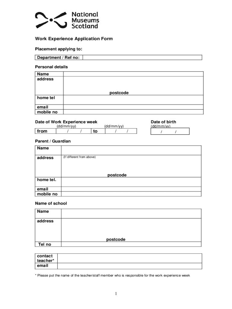 Work Experience Application Form Placement applying to: Department / Ref no: Personal details Name address postcode home tel email mobile no Date of Work Experience week (dd/mm/by)from/Date of birth
