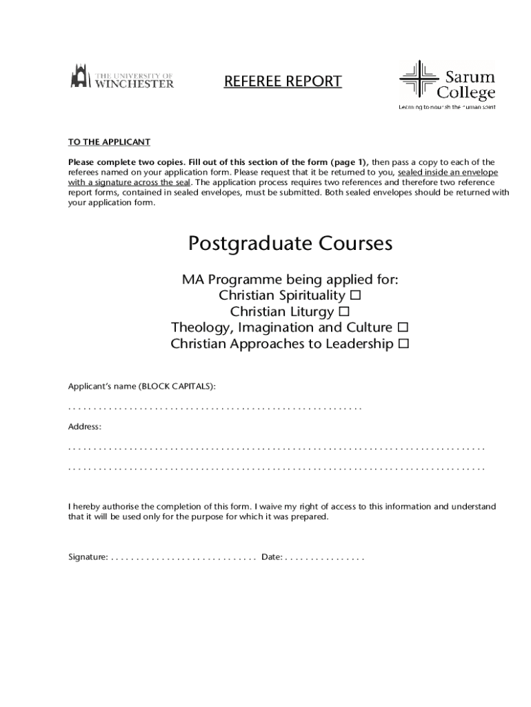REFEREE REPORT TO THE APPLICANT Please complete two copies. Fill out of this section of the form (page 1), then pass a copy to each of the referees named on your application form. Please request that