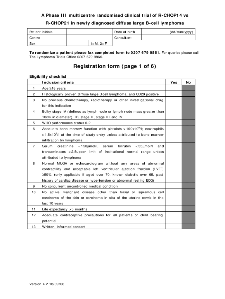 A Phase III multigenre randomized clinical trial of RCHOP14 vs RCHOP21 in newly diagnosed diffuse large Cell lymphoma Patient initialsDate of birthCentreConsultantSex(dd/mm/YYY)1M, 2FTo randomize