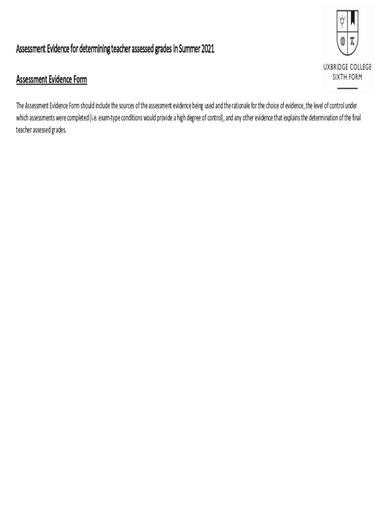 Assessment Evidence for determining teacher assessed grades in Summer 2021 Assessment Evidence Form The Assessment Evidence Form should include the sources of the assessment evidence being used and