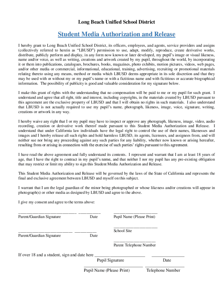 Long Beach Unified School DistrictStudent Media Authorization and Release I hereby grant to Long Beach Unified School District, its officers, employees, and agents, service providers and assigns (collectively