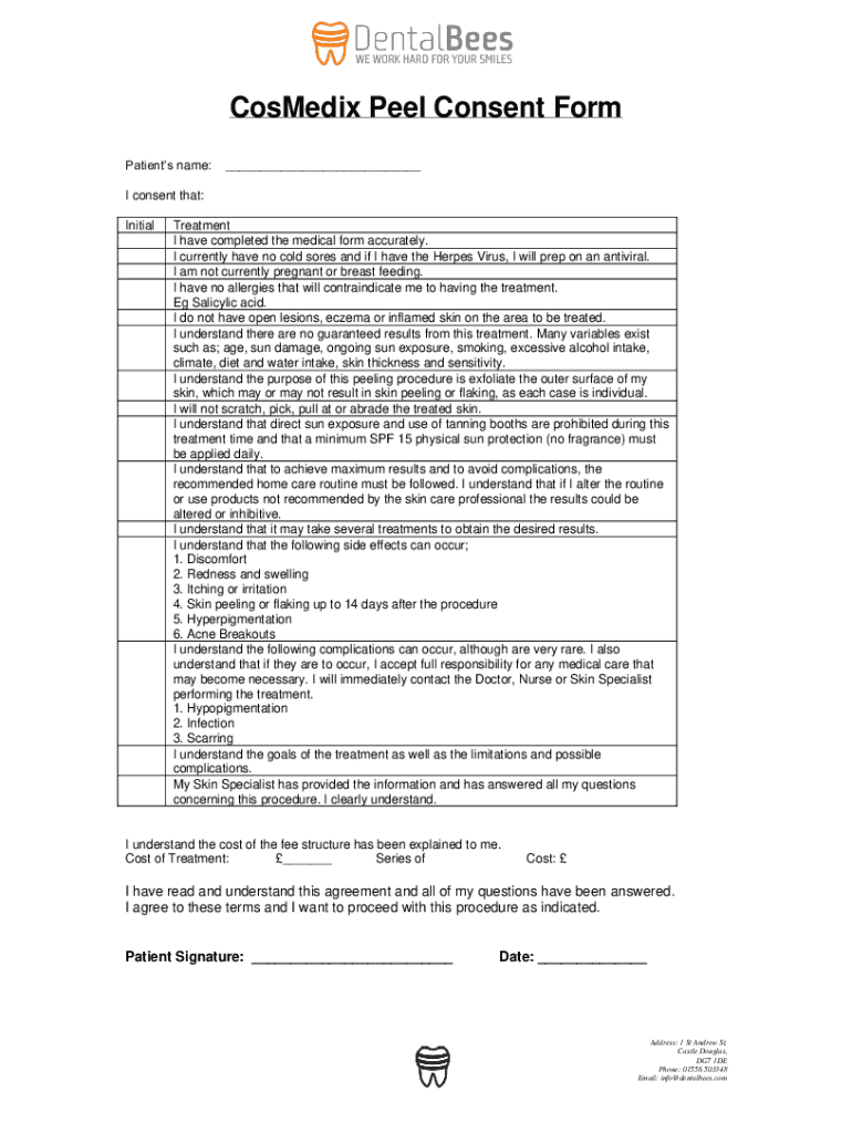 Comedic Peel Consent Form Patients name: I consent that: InitialTreatment I have completed the medical form accurately. I currently have no cold sores and if I have the Herpes Virus, I will prep on