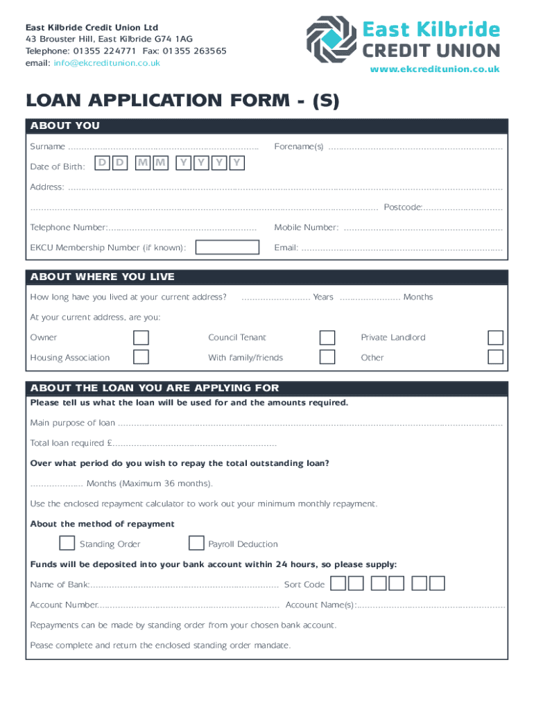 East Bride Credit Union Ltd 43 Br ouster Hill, East Bride G74 1AG Telephone: 01355 224771 Fax: 01355 263565 email: info@ekcreditunion.co.ukwww.ekcreditunion.co.ukLOAN APPLICATION FORM (S) ABOUT YOU