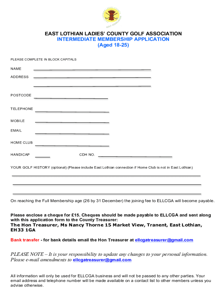EAST LATVIAN LADIES COUNTY GOLF ASSOCIATION INTERMEDIATE MEMBERSHIP APPLICATION (Aged 1825) PLEASE COMPLETE IN BLOCK CAPITALSNAME ADDRESSPOSTCODETELEPHONE MOBILE EMAIL HOME CLUB HANDICAP CDH NO.YOUR