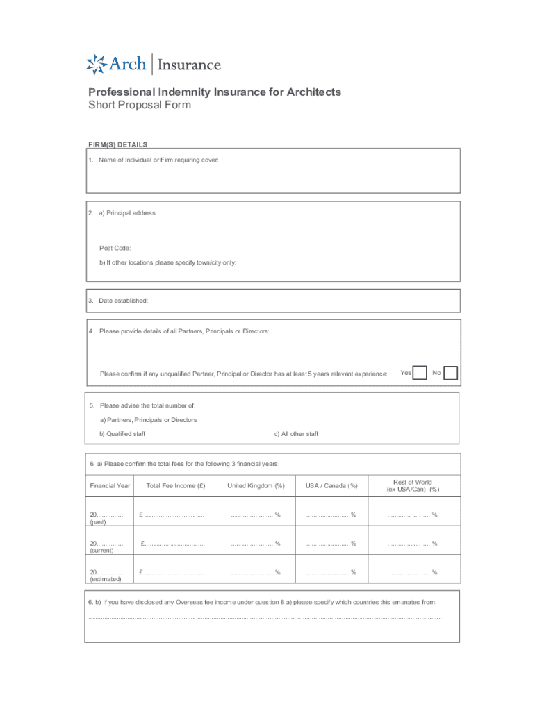 Professional Indemnity Insurance for Architects Short Proposal Nonprofessional Indemnity Insurance for Architects Short Proposal Former(S) DETAILS 1. Name of Individual or Firm requiring cover:2.