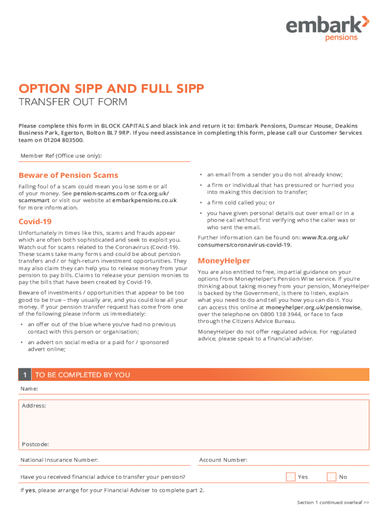 OPTION SIPP AND FULL SIPP TRANSFER OUT Formulas complete this form in BLOCK CAPITALS and black ink and return it to: Embark Pensions, Don't scar House, Eakins Business Park, Edgerton, Bolton BL7 9RP.