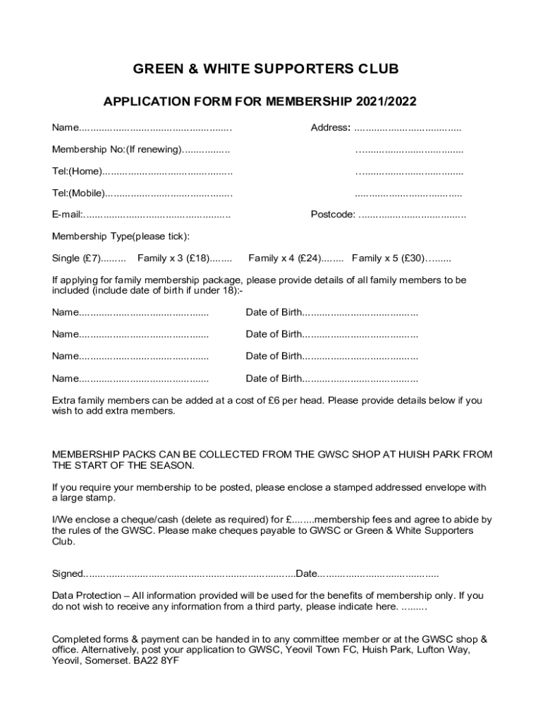 GREEN & WHITE SUPPORTERS CLUB APPLICATION FORM FOR MEMBERSHIP 2021/2022 Name...................................................... Address: ...................................... Membership No:(If
