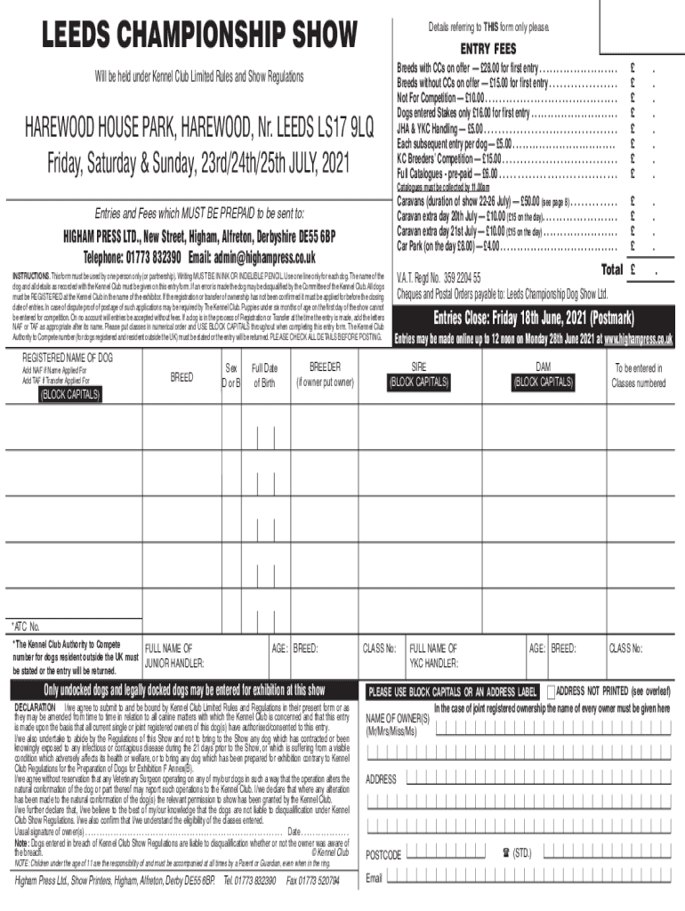 LEEDS CHAMPIONSHIP Horsetails referring to THIS form only please. ENTRY FEES Breeds with CCs on offer 28.00 for first entry. . . . . . . . . . . . . . . . . . . . . . . Breeds without CCs on offer