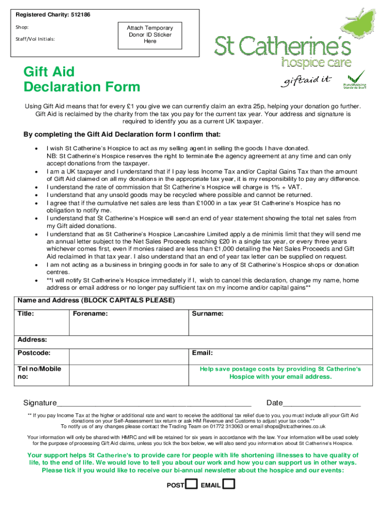 Registered Charity: 512186 Shop:Attach Temporary Donor ID Sticker Falstaff/Vol Initials:Gift Aid Declaration Form Using Gift Aid means that for every 1 you give we can currently claim an extra 25p,