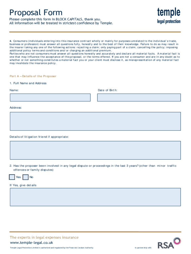 Proposal Form Please complete this form in BLOCK CAPITALS, thank you. All Information will be treated in the strictest confidence by Temple. Advice on applying for Clinical Negligence and Dental Negligence