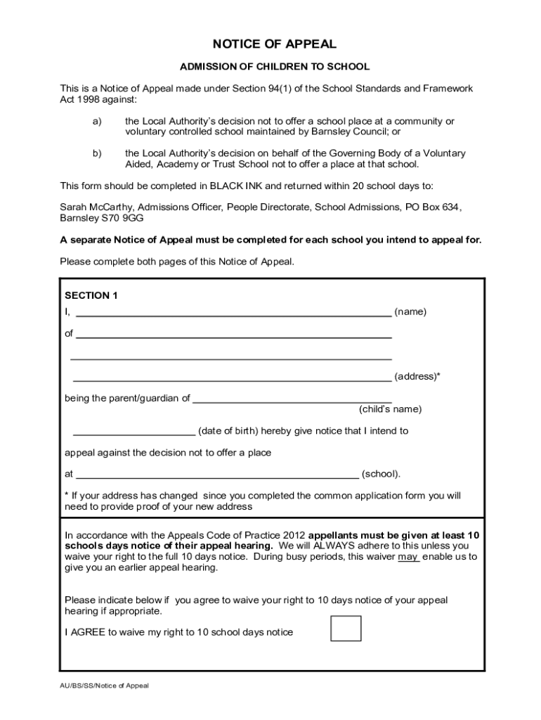 NOTICE OF APPEAL ADMISSION OF CHILDREN TO SCHOOL This is a Notice of Appeal made under Section 94(1) of the School Standards and Framework Act 1998 against: a)the Local Authorities decision not to