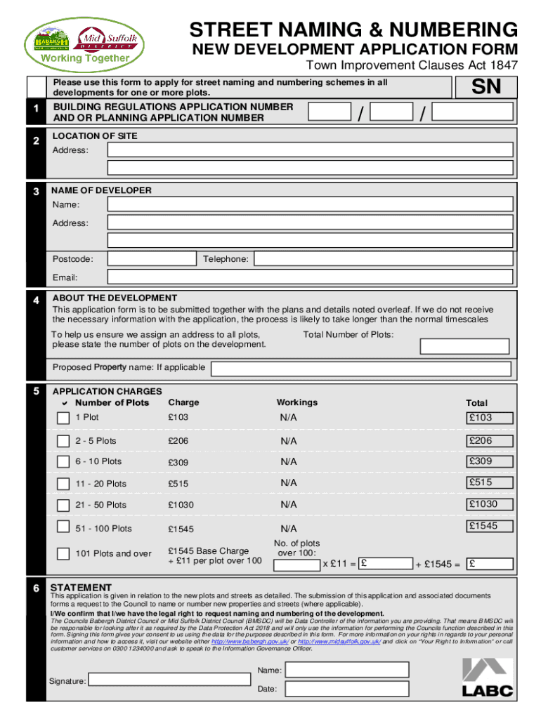 STREET NAMING & NUMBERING NEW DEVELOPMENT APPLICATION FORM Town Improvement Clauses Act 1847 displease use this form to apply for street naming and numbering schemes in all developments for one or