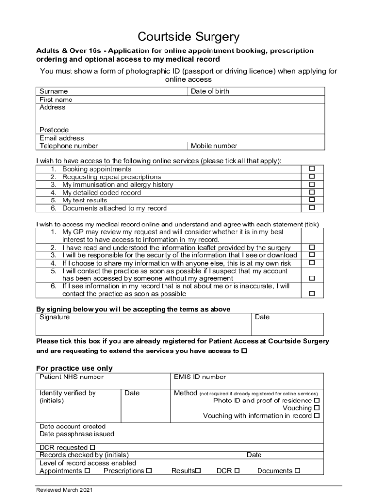 Courtside Surgery Adults & Over 16s Application for online appointment booking, prescription ordering and optional access to my medical record You must show a form of photographic ID (passport or