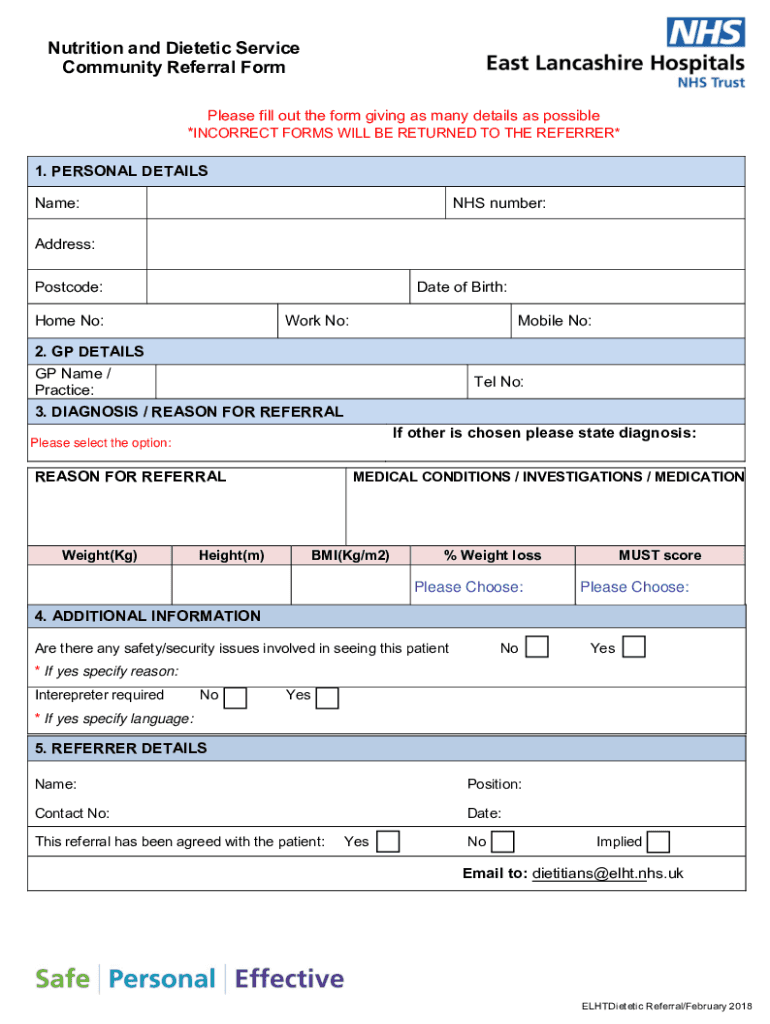Nutrition and Dietetic Service Community Referral Form Please fill out the form giving as many details as possible×INCORRECT FORMS WILL BE RETURNED TO THE REFERRER* 1. PERSONAL DETAILS Name:NHS number:Address: