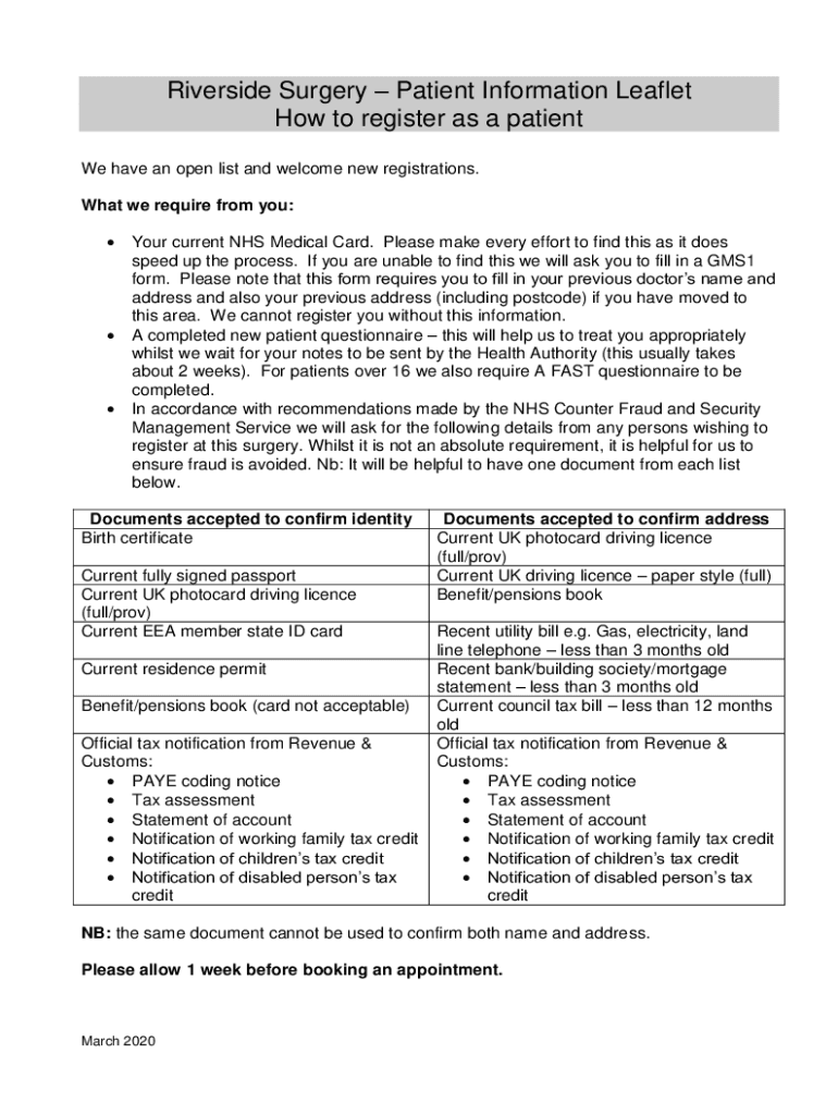 Riverside Surgery Patient Information Leaflet How to register as a patient We have an open list and welcome new registrations. What we require from you: Your current NHS Medical Card. Please make