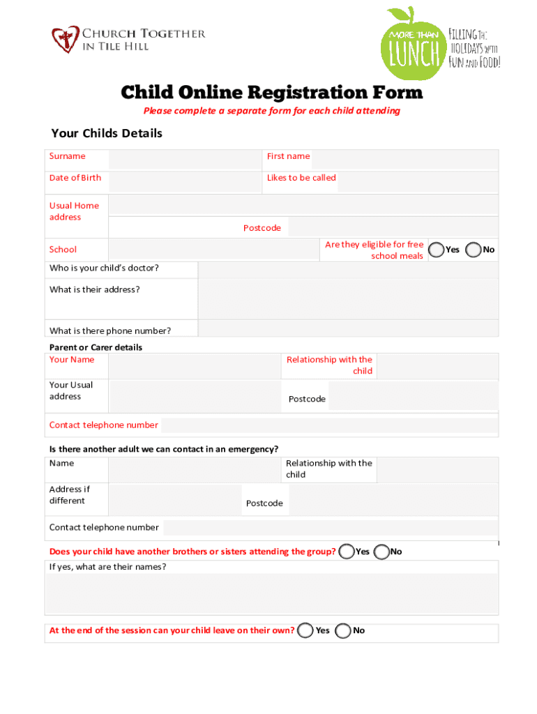 Child Online Registration Form Please complete a separate form for each child attendingYour Child's Details SurnameFirst namesake of Birthplaces to be calledUsual Home addressPostcode Are they eligible