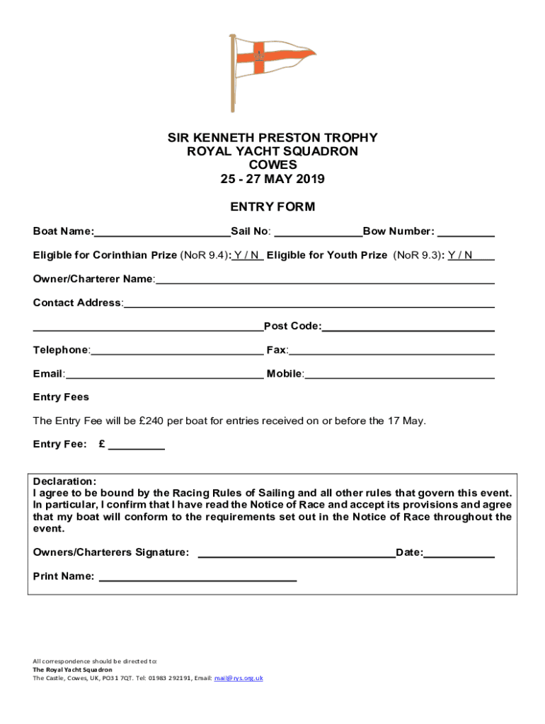 SIR KENNETH PRESTON TROPHY ROYAL YACHT SQUADRON COMES 25 27 MAY 2019 ENTRY FORM Boat Name:Sail No:Bow Number:Eligible for Corinthian Prize (Nor 9.4): Y / N Eligible for Youth Prize (Nor 9.3): Y /