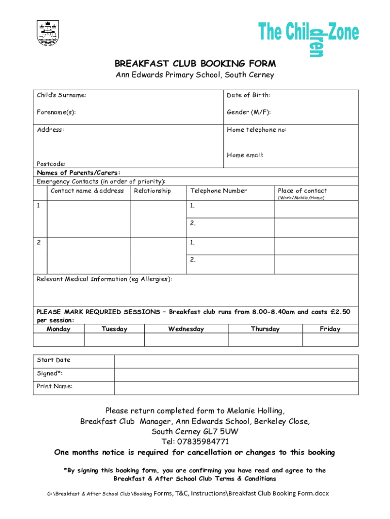 Get the free BREAKFAST CLUB BOOKING FORM - annedwards.gloucs.sch.uk - annedwards gloucs sch