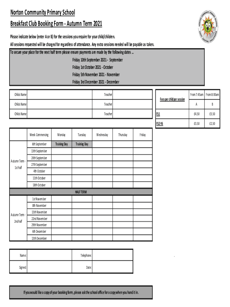 Norton Community Primary School Breakfast Club Booking Form Autumn Term 2021 Please indicate below (enter A or B) for the sessions you require for your child/children. All sessions requested will